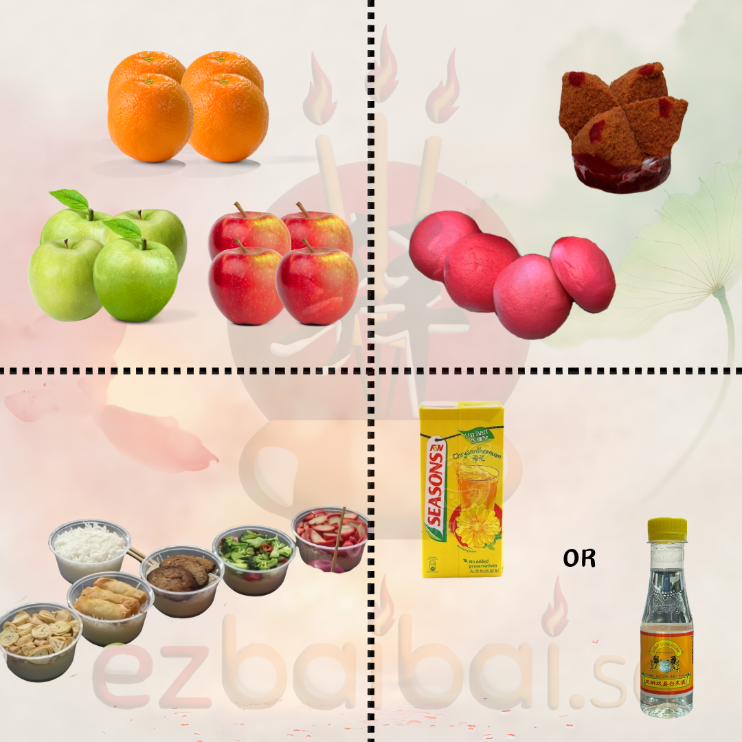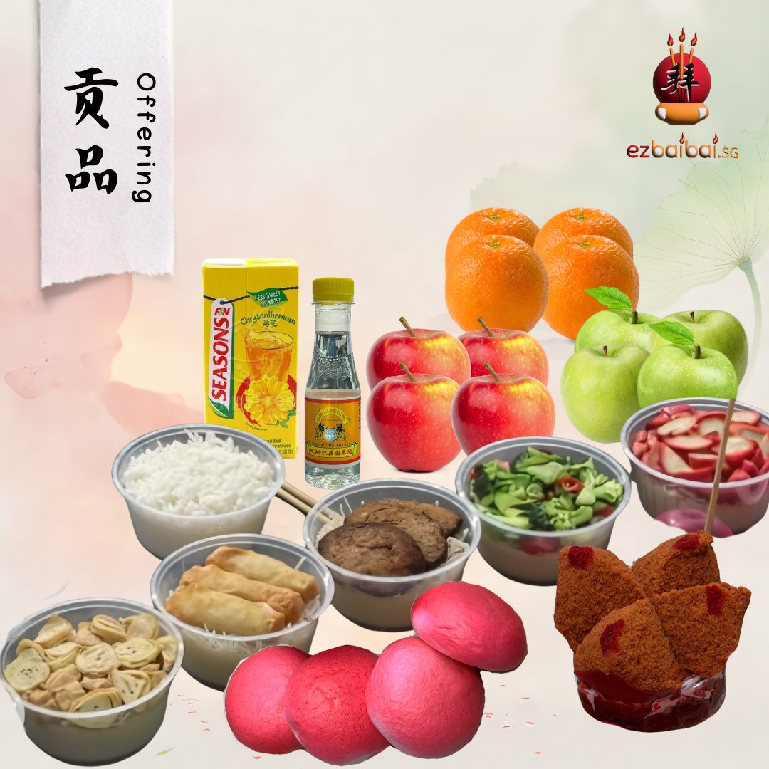 We provide complete Qing Ming food offering sets prepared for ancestor prayers.