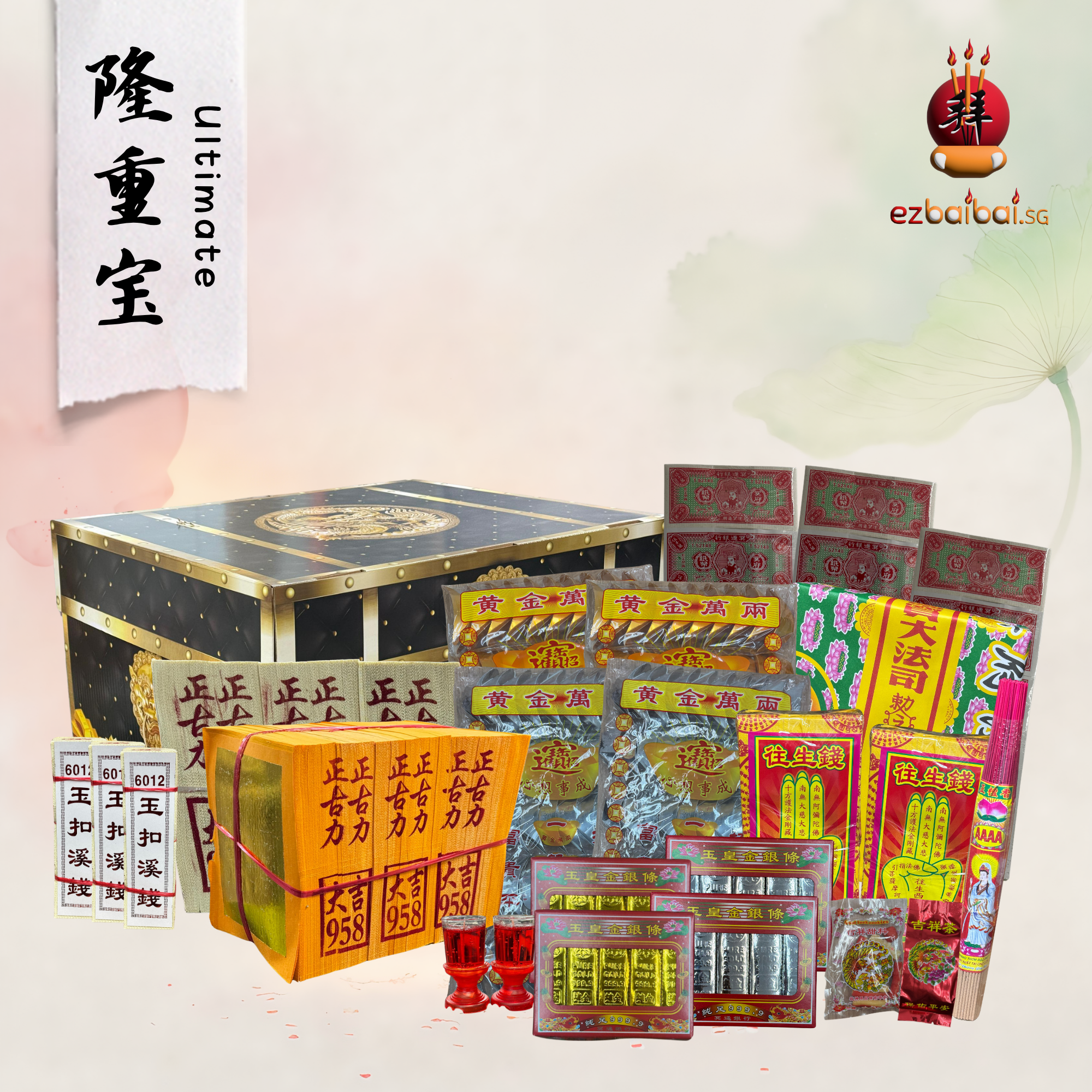 This Ultimate Package With Food consists of essential joss paper items commonly used for traditional prayers and offering ceremonies.