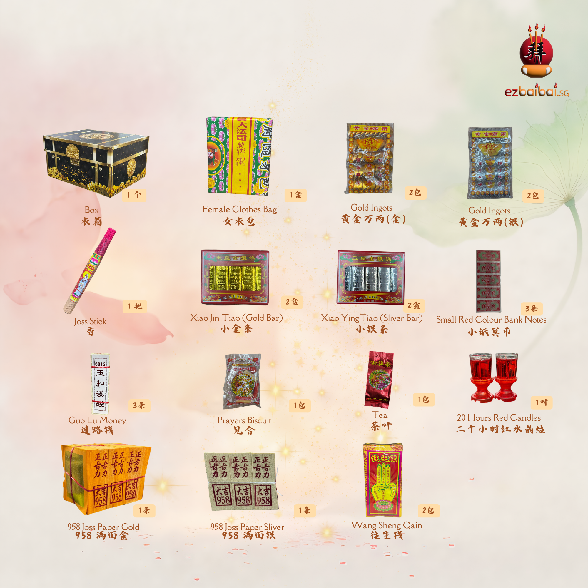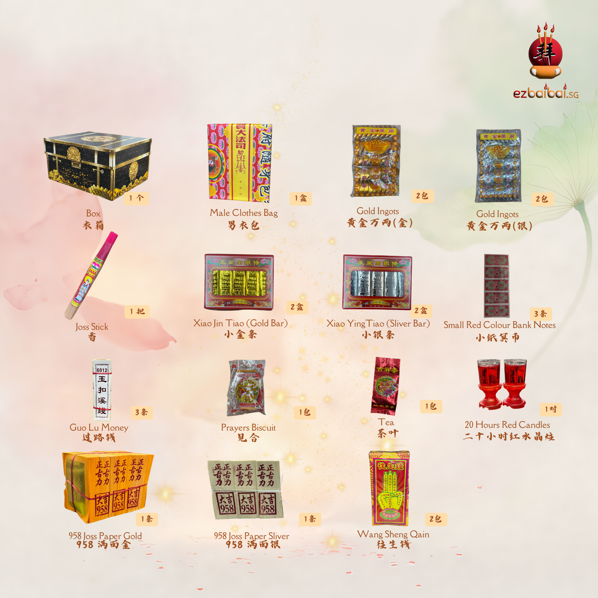 此吉祥宝配套(含供品)包含传统祭拜常用的基本金银纸用品,