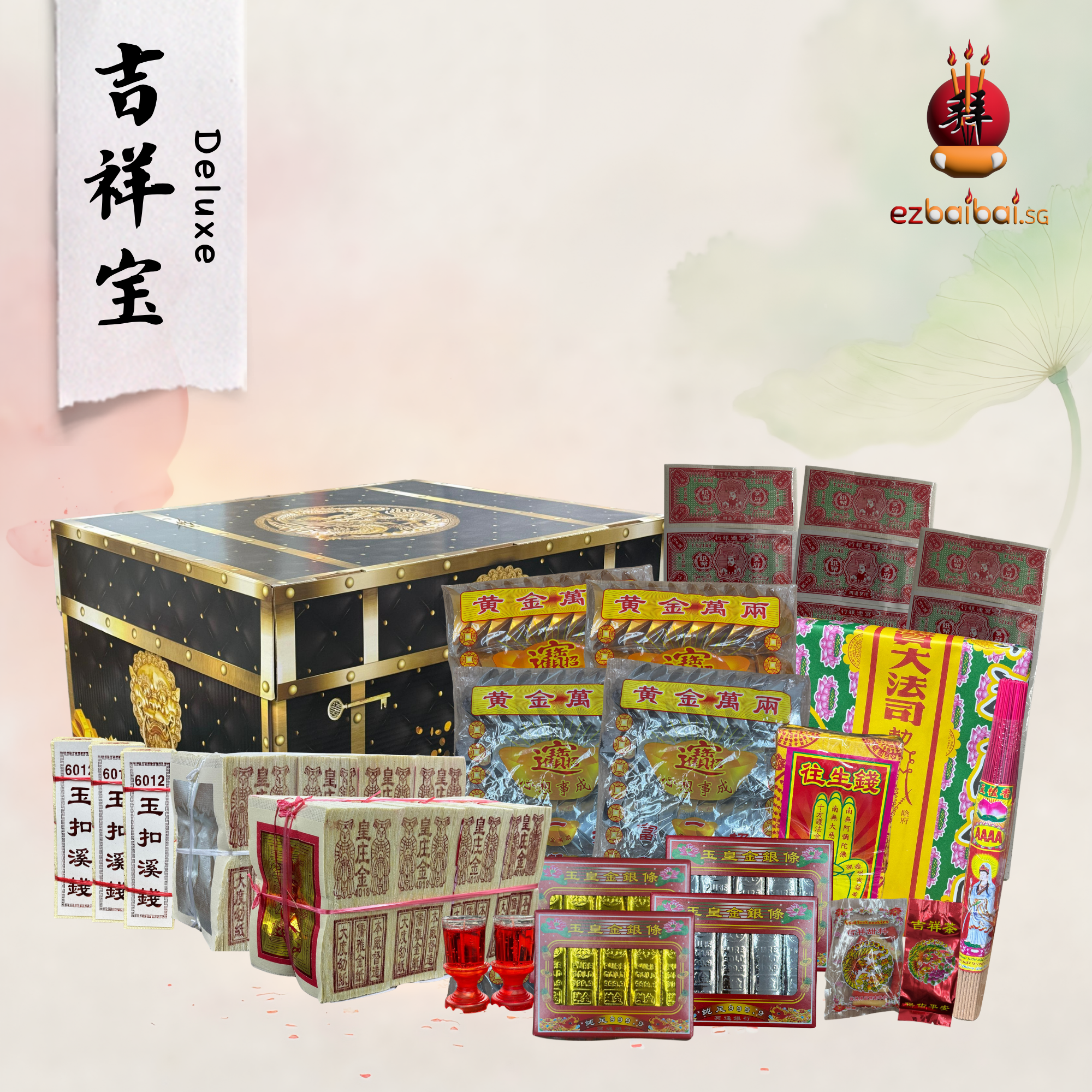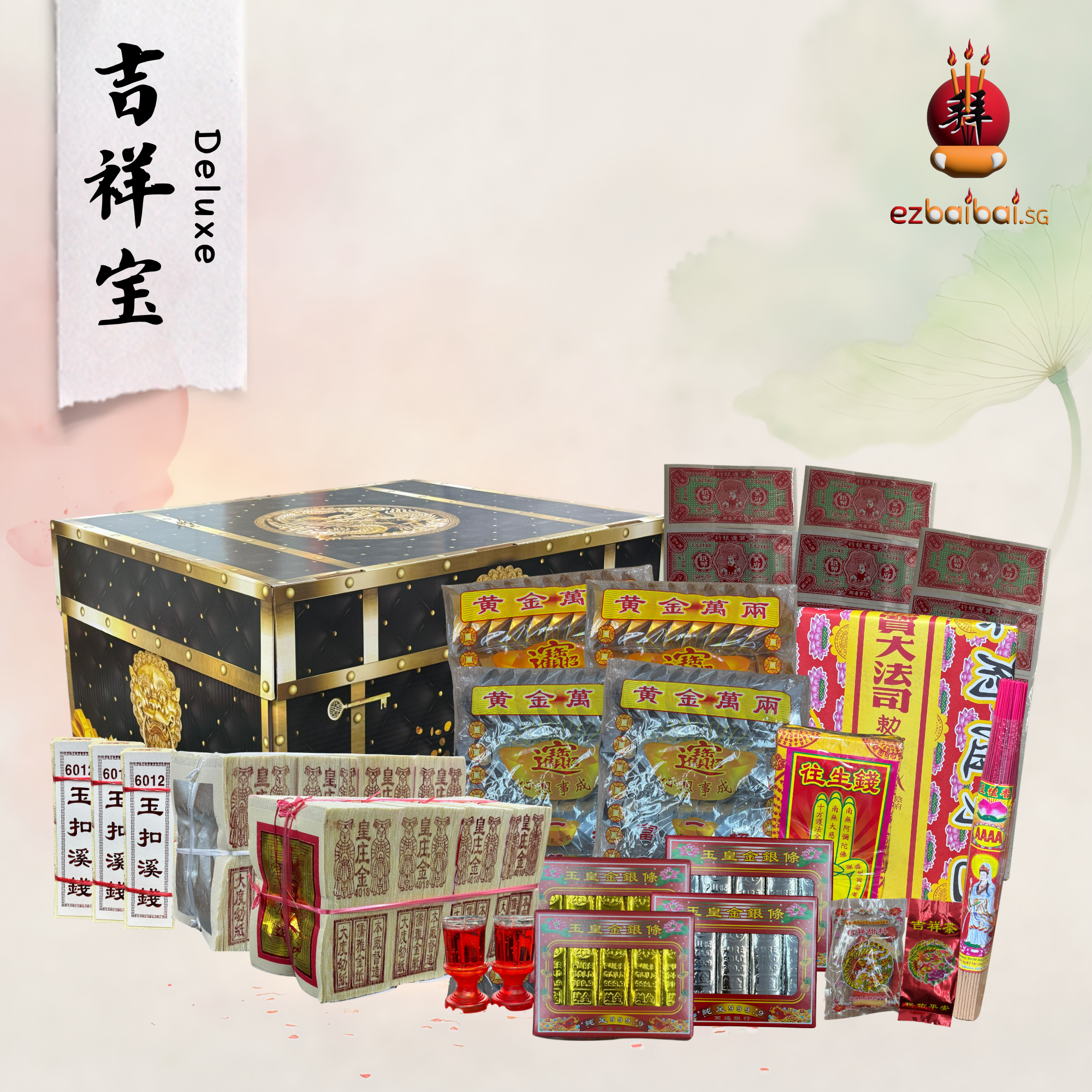 This Premium Package With Food consists of essential joss paper items commonly used for traditional prayers and offering ceremonies.